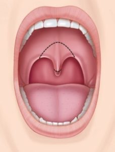 We break down surgery into phases. Phase one surgery involves tightening and reshaping the soft palate and removing the tonsils if present. (Figure 4). The procedure is called a uvulopalatopharyngoplasty or UPPP. We perform a safer modification called a uvulopalatal flap. This preserves the soft palate musculature, improves the recovery, and limits the complications such as food or liquids coming up through the nose which can occur with a standard UPPP. If the patient has tonsils present, we either remove them entirely or shrink them using radiofrequency tissue reduction technology.